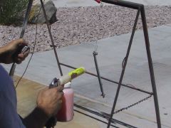 These pics are of the powder coating process.Prior to applying the powder coating to the items to be painted, each item has to be sandblasted. After the coating has been applied the items are placed in an oven to bake the coating on. |