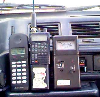 If you like to drive with a bunch of gizmos activated, you probably don't like to have them diving onto the floor every time you make a turn. I've solved the problem for the cell phone, ham radio, and Geiger counter: