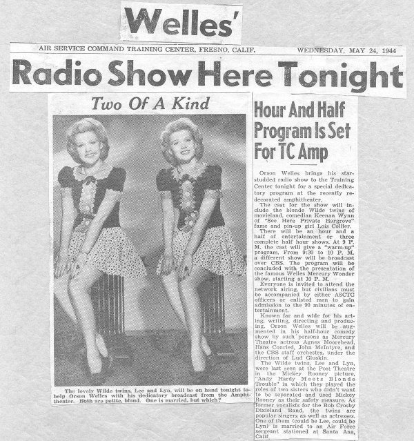 Caption reads: The lovely Wilde twins, Lee and Lyn, will be on hand tonight to help Orson Welles with his dedicatory broadcast from the Amphitheater. Both are petite, blond. One is married, but which? Column reads: Orson Welles brings his star-studded radio show to the Training Center tonight for a special dedicatory program at the recently redecorated amphitheater. The cast for the show will include the blonde Wilde twins of movieland, comedian Keenan Wynn of "See Here Private Hargrove" fame and pin-up girl Lois Collier. There will be an hour and a half of entertainment or three complete half hour shows. At 9 P.M. the cast will give a "warm-up" program. From 9:30 to 10 P.M. a different show will be broadcast over CBS. The program will be concluded with the presentation of the famous Welles Mercury Wonder show, starting at 10 P.M. Everyone is invited to attend the network airing, but civilians must be accompanied by either ASCTC officers or enlisted men to gain admission to the 90 minutes of entertainment. Known far and wide for his acting, writing, directing and producing, Orson Welles will be augmented in his half-hour comedy show by such persons as Mercury Theatre actress Agnes Moorehead, Hans Conried, John McIntyre, and the CBS staff orchestra under the direction of Lud Cluskin. The Wilde twins, Lee and Lyn, were last seen at the Post Theatre in the Mickey Rooney picture, "Andy Hardy Meets Blonde Trouble" [sic] in which they played the roles of two sisters who didn't want to be separated and used Mickey Rooney as their safety measure. As former vocalists for the Bob Crosby Dixieland Band, the twins are popular singers as well as actresses. One of them (could be Lee, could be Lyn) is married to an Air Force sergeant stationed at Santa Ana, Calif. Says Lee: "As usual, they haven't identifyed us correctly, I (Lee) am on the right as you look at the picture. And, oh yes, Lyn was married at the time to Jim Cathcart, who was a sergeant in the Air Force Band at Santa Ana. I married Tom C. later. He was a 1st Lt. in the Air Force." Note: The broadcast is available on audio cassette (click here for details)! |